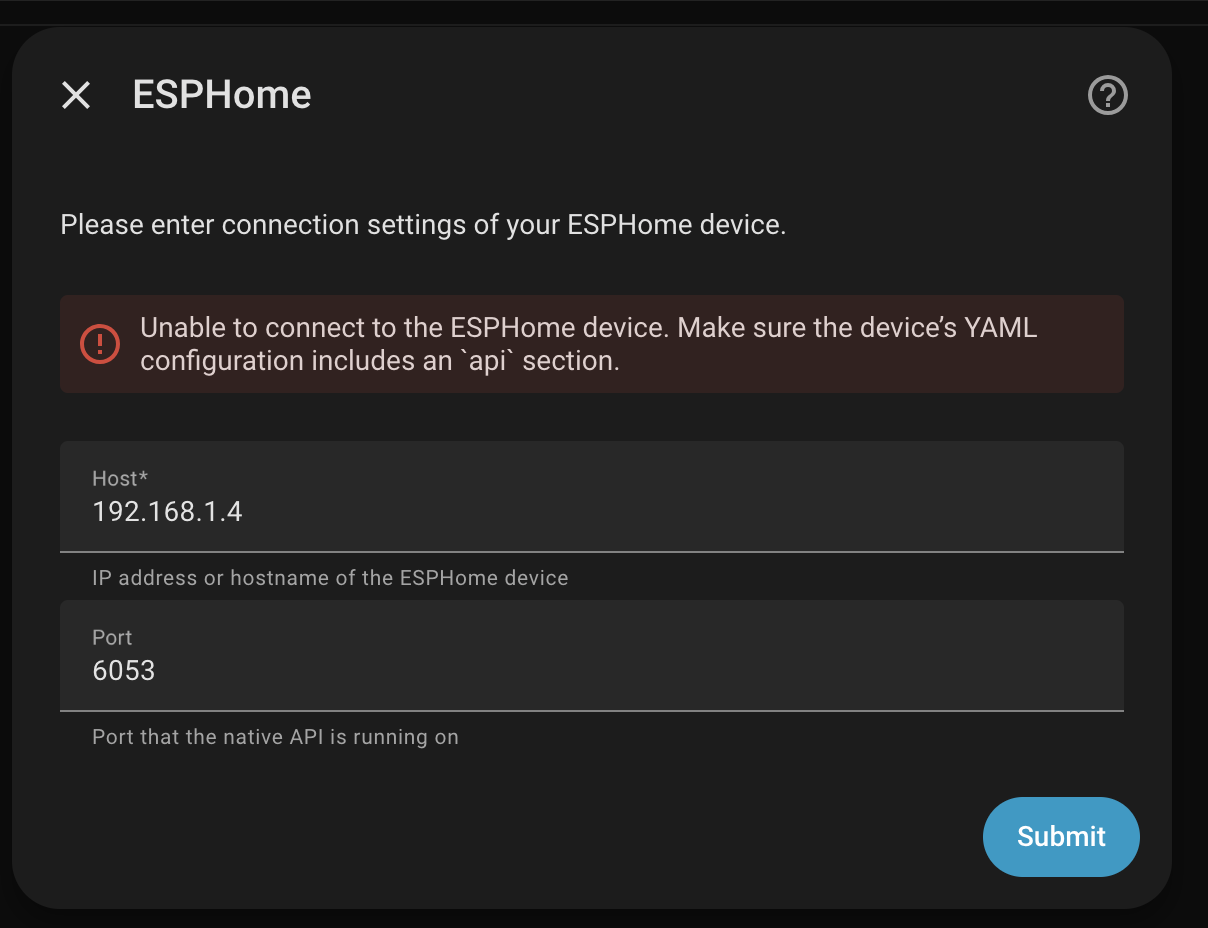 While the tone was sounding, I did try to configure the device in my home assistant. I selected "Add Device", saw ESPHome and selected it, and was presented with a modal asking for the host ip address, which I provided. I got a "Unable to connect to the ESPHome device. Make sure the device's YAML configuration includes an 'api' section." as shown in the attached screenshot. I have no way to access any YAML that the device might be using since I can't access the device and can't do anything with it in Home Assistant.
