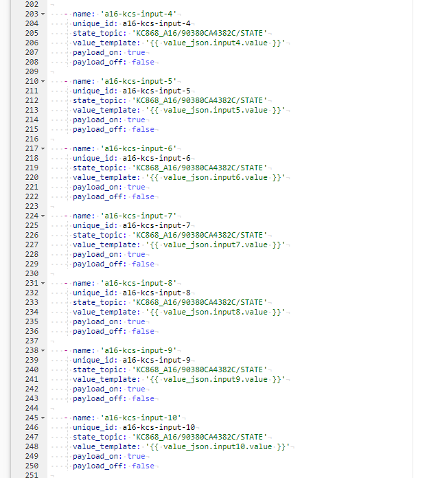 you only need add 16 DO and 16 DI command. The server topic because i have also added KC868-Server, you not need to use. so you need to 16 DO and 16 DI as these format: - name: 'a16-kcs-output-1' unique_id: a16-kcs-output-1 state_topic: 'KC868_A16/B48A0A404560/STATE' replace B48A0A404560 with your boad's ID, you can check in your board webpage. command_topic: 'KC868_A16/B48A0A404560/SET' replace B48A0A404560 with your boad's ID, you can check in your board webpage. payload_on: '{"output1":{"value":true}}' payload_off: '{"output1":{"value":false}}' value_template: '{{ value_json.output1.value }}' state_on: true state_off: false - name: 'a16-kcs-input-1' unique_id: a16-kcs-input-1 state_topic: 'KC868_A16/B48A0A404560/STATE' replace B48A0A404560 with your boad's ID value_template: '{{ value_json.input1.value }}' payload_on: true payload_off: false