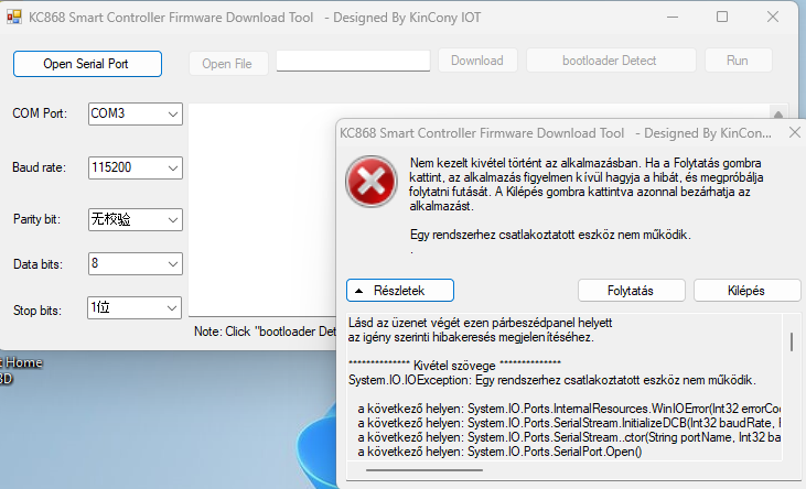 I'm getting an error message when I click on "Open Serial Port" in "KC868 Controller Bootloader.exe" GUI on Windows 11.