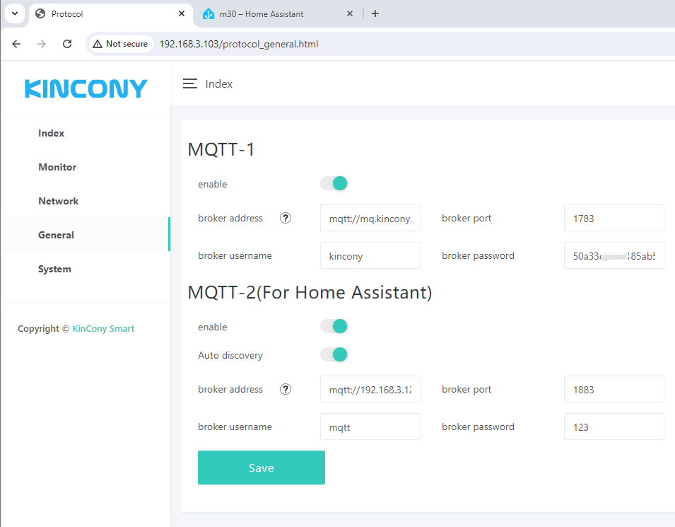 setting for MQTT-1 and MQTT-2. MQTT-1 connect to your own private MQTT cloud server. MQTT-2 use for home assistant MQTT broker. If you want to use Auto Discovery function, just enable it.