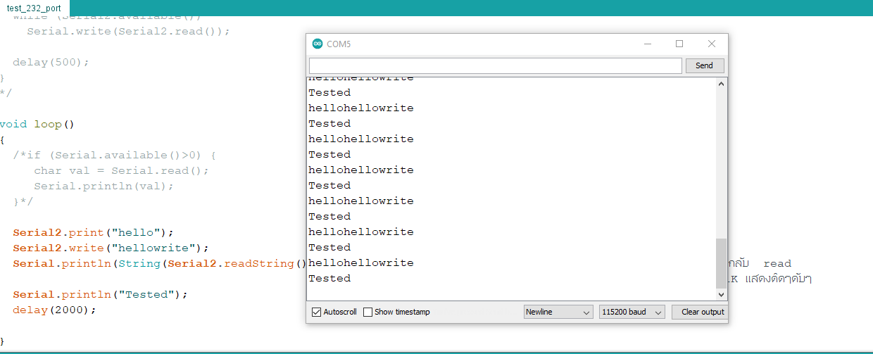 Serial.println(String(Serial2.readString())); //ทดสอบ port rs232 โดยการส่งค่าwrite(hellowwrite) แล้วอ่านค่ากลับ read
