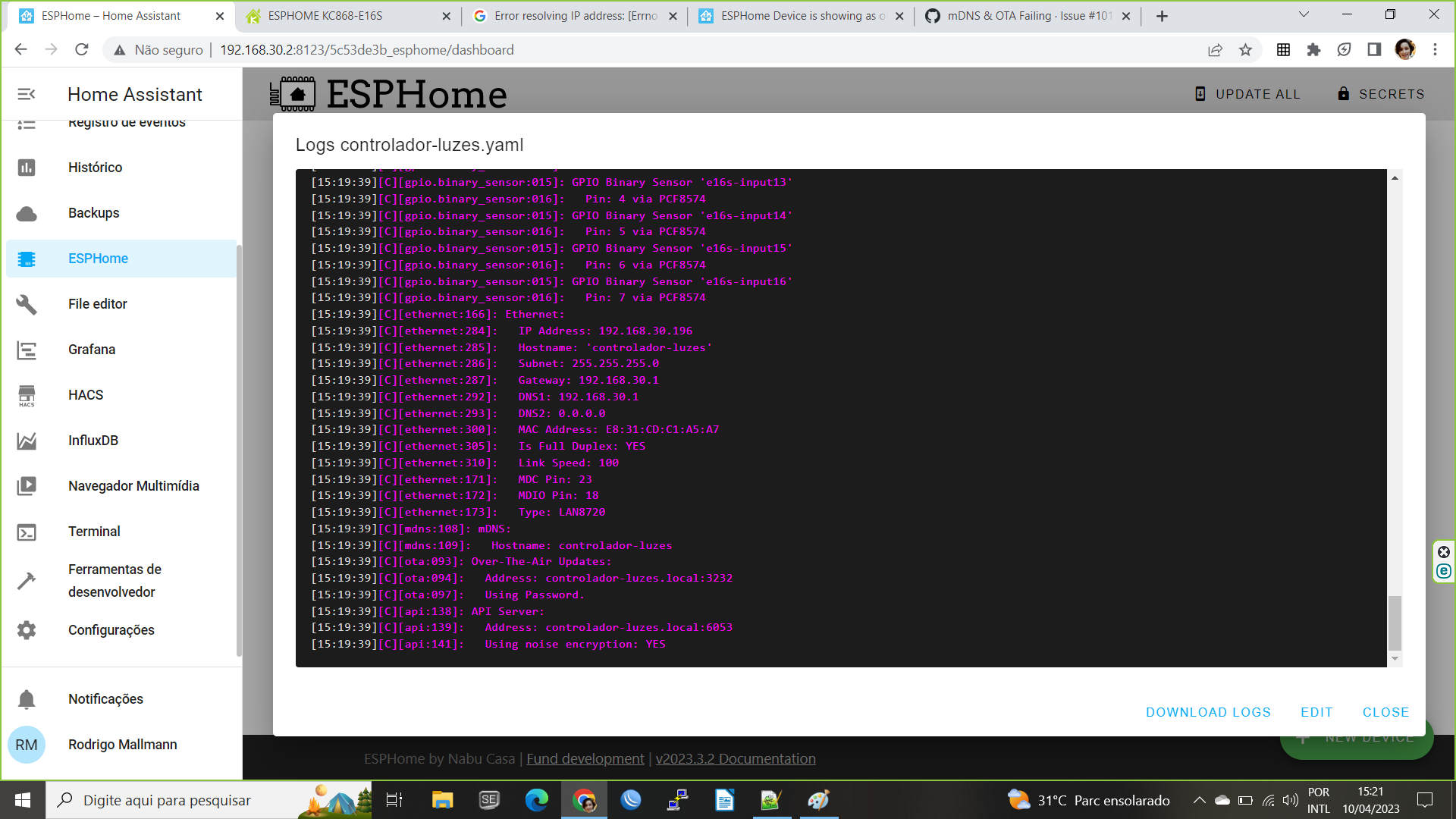 Esse print peguei no carregamento do controlador onde mostra que ele recebeu ip do roteador, mas nao se comunica com o home assistant.