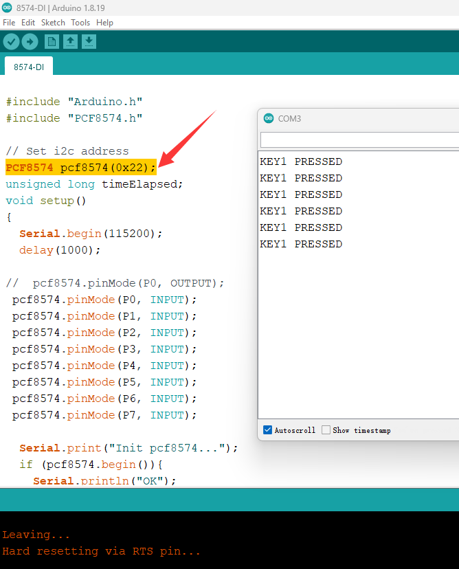 After uploading I see that all 8 Inports give "pressed key", continiously. Making contact between ground and 1 port (1 to 8) give no change.