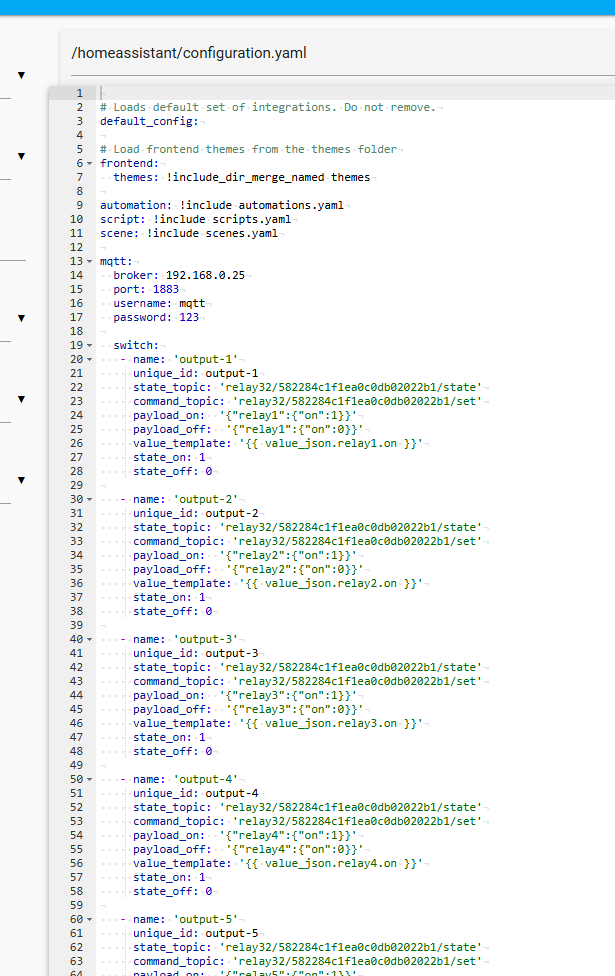 In the file editor I added the configuration code with the Broker IP adress of the Raspberry pie 5 it's running on, and filled in the correct UID.
