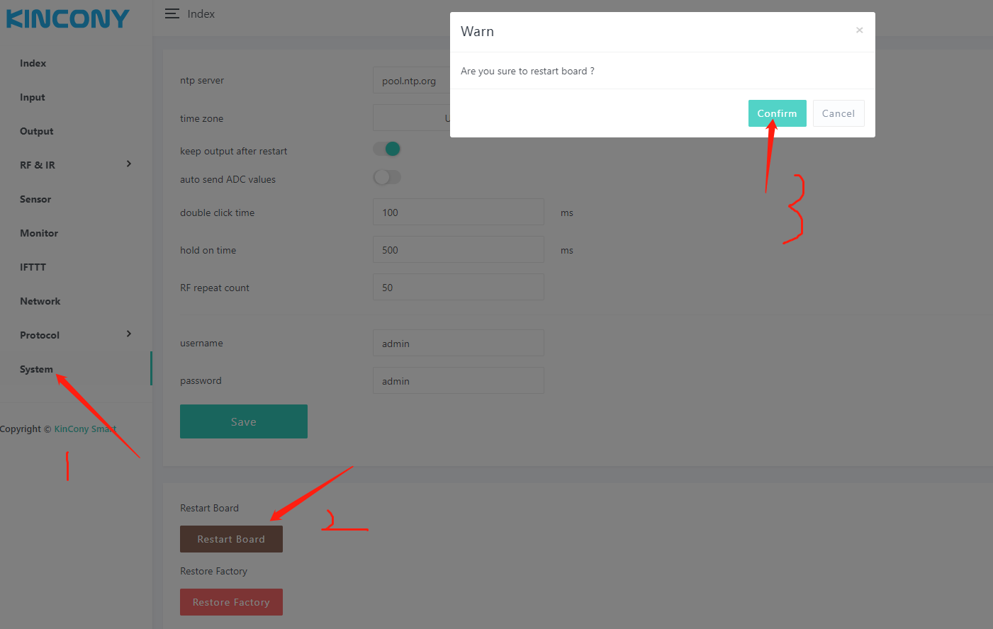 (09-20-2023, 08:29 AM)KinCony Support Wrote:after you set the all parameters,go to system and click restart board, Remember: all settings finished,you should click "restart board" this key(09-20-2023, 04:52 AM)engmohades Wrote:(09-19-2023, 10:17 PM)admin Wrote: take a photo of your IFTTT command.