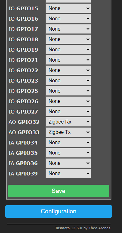 tasmota config module GPIO for Zigbee module RXD,TXD pins: