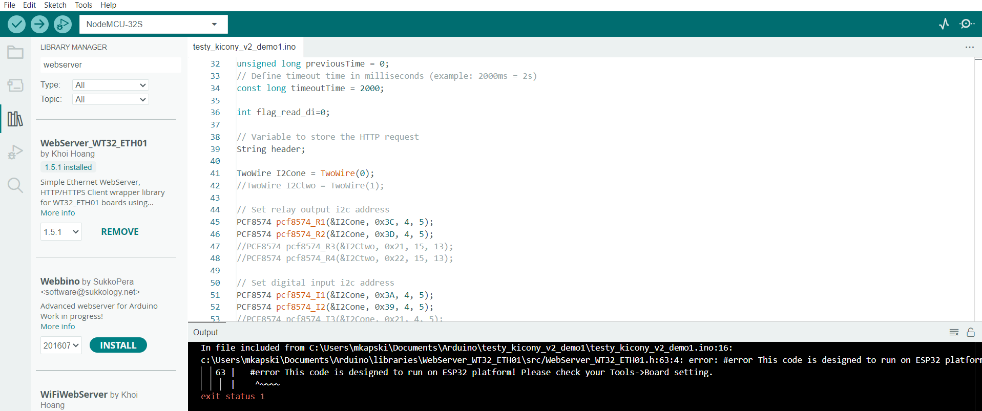 Probably you have to use Renzo Mischianti's PCF8574 library. Now the problem is the ETH.h library - which one to use? I have installed https://docs.arduino.cc/libraries/ethernet/ in newest version but I see that the esp32 library has its own ETH.h (so I uninstalled my) libraries. It says that constants should be defined, for example:
