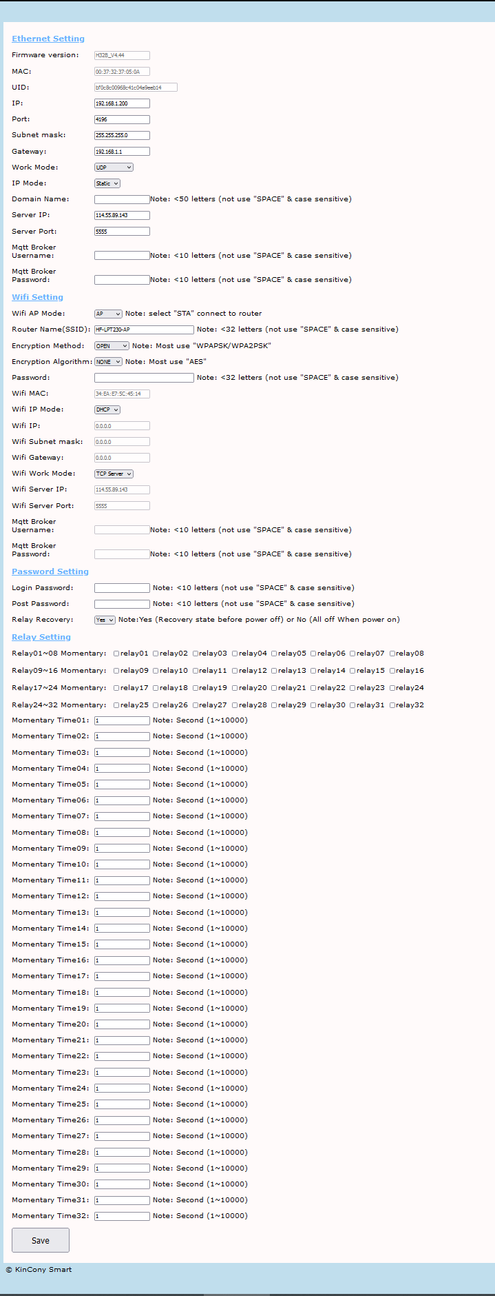 Online Store: https://shop.kincony.com Alibaba Store: https://kincony.en.alibaba.com/ (08-03-2022, 03:25 AM)admin Wrote: 1. take a screen photo of your network setting webpage. Thanks. 1, I attached a photo 2, https://www.youtube.com/watch?v=yIVPCTmbKzg I created Floor and Room settings. -The yellow led lights up on the controller next to the power connector. -The red and blue LEDs light up next to the LAN connector. -I'm using a LAN. I can operate the device from a computer, but not from Android.
