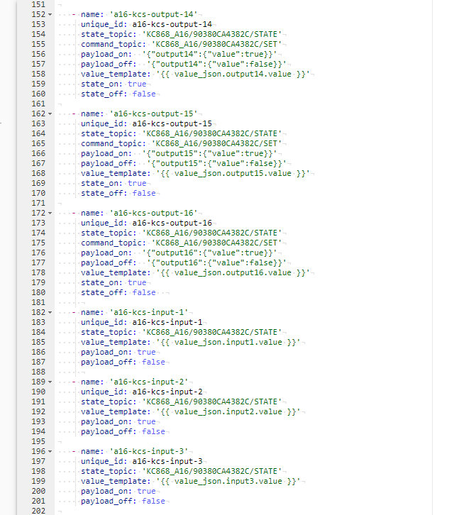 you only need add 16 DO and 16 DI command. The server topic because i have also added KC868-Server, you not need to use. so you need to 16 DO and 16 DI as these format: - name: 'a16-kcs-output-1' unique_id: a16-kcs-output-1 state_topic: 'KC868_A16/B48A0A404560/STATE' replace B48A0A404560 with your boad's ID, you can check in your board webpage. command_topic: 'KC868_A16/B48A0A404560/SET' replace B48A0A404560 with your boad's ID, you can check in your board webpage. payload_on: '{"output1":{"value":true}}' payload_off: '{"output1":{"value":false}}' value_template: '{{ value_json.output1.value }}' state_on: true state_off: false - name: 'a16-kcs-input-1' unique_id: a16-kcs-input-1 state_topic: 'KC868_A16/B48A0A404560/STATE' replace B48A0A404560 with your boad's ID value_template: '{{ value_json.input1.value }}' payload_on: true payload_off: false