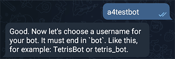 Then, when asked to specify the name of the new bot, we enter the name of the test bot to control our KC868-A4 controller – “a4testbot”.