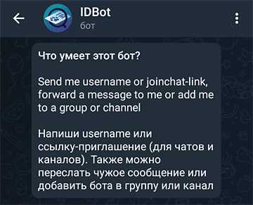 In order to get the Telegram user ID, we need to use another bot – IDBot. We find it similarly to the above method for BotFather and get the following greeting.