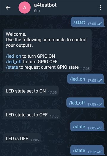 Well, a visual result of the work of our Telegram bot in the form of a screenshot. Pay attention to the last “/state” command, which had no effect – this happens when the Arduino controller is turned off (or unavailable for any reason) – the bot simply stops responding to your commands in the Telegram interface.