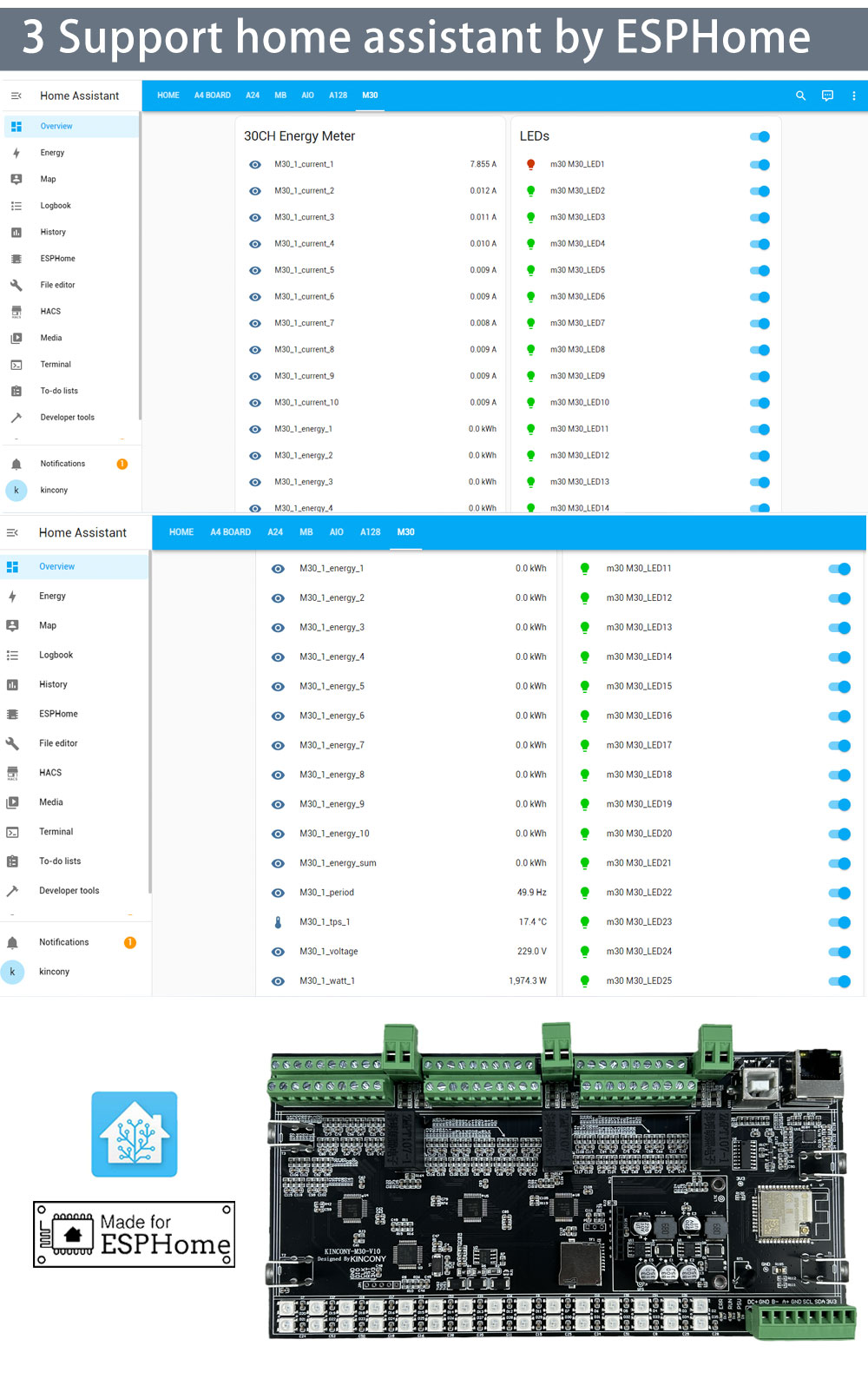 We have designed 30 Channel ESP32 energy monitor open source board – M30 (ESP32 30 Channel CT Clamp Energy Monitor) for home automation DIYer. The hardware have 30CH CT Clamp sensor INPUT ports + 3CH ZMPT101B voltage sensor + SD card + 30CH RGB colorful LED for current value. Ethernet+RS485+4G modbus 30CH high-accuracy energy meter ic-BL0910 with CT clamp. it can easy integrate to home assistant by ESPHome.
