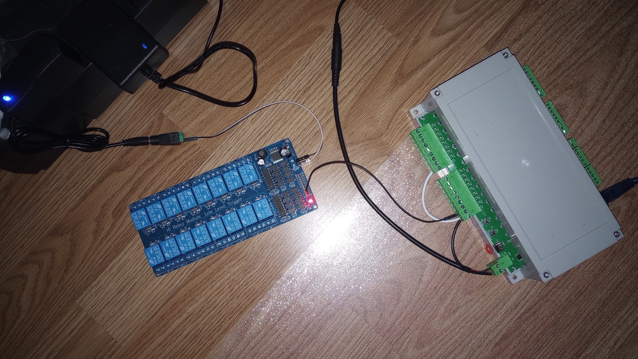 Ok, I finally received the relay module and set it up as you can see in the picture. I also attached a single cable from the KC868-A16 output 1 to the port 1 pin on the relay module, for testing. That did not work to power the relay module (no LED light came on on the relay module), so I attached a separate 12V 1A power supply to the relay module which did cause the LED to turn on.