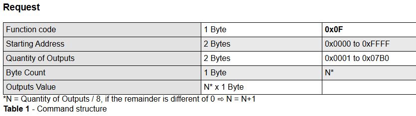 but for me it is not the modbus standard, the "ByCout" byte is missing I have been using my software for over 20 years and it works with all PLCs. Here is an example with a Twido PLC SLave :1 Cf : F Adress : 0 0 Nb : 8 BYTE Count : 1 CRC : BE D5