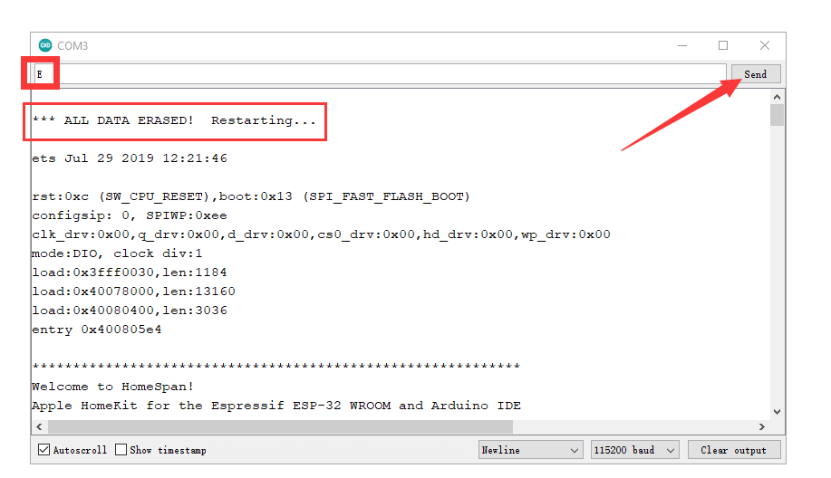 if you want to eraser all data , re-config homespan, then you can send "E" to serial port.