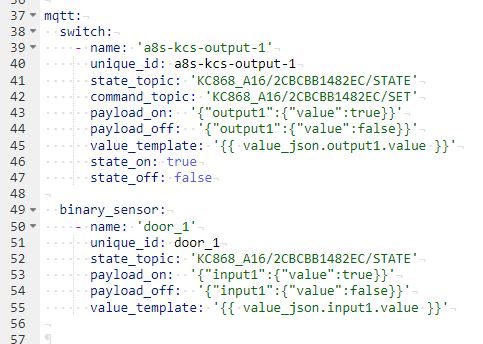they can be managed from HAOS (also in 2.2.5) and follows status change (fixed with 2.2.6). The problem remain on Inputs, I cannot see any status change and they are always in "unknown" status. I tryied many options, finally I found the working configuration for inputs: mqtt: switch: - name: "a161-kcs-output-1" unique_id: a161-kcs-output-1 state_topic: "KC868_A16/XXXXXXXXX/STATE" command_topic: "KC868_A16/XXXXXXXXX/SET" payload_on: '{"output1":{"value":true}}' payload_off: '{"output1":{"value":false}}' value_template: "{{ value_json.output1.value }}" state_on: true state_off: false binary_sensor: these are wrong: payload_on: '{"input1":{"value":true}}' payload_on: "true" payload_on: true (Incorrect type. Expected "string") this is working for me - name: "a161-kcs-input-2" unique_id: a161-kcs-input-2 state_topic: "KC868_A16/XXXXXXXXX/STATE" value_template: "{{ value_json.input2.value }}" payload_on: "True" payload_off: "False"