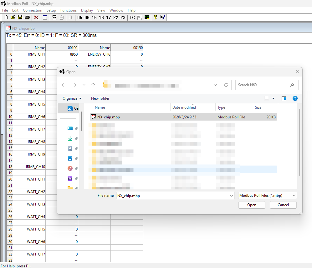1: open NX_chip.mbp in modbus pull software.