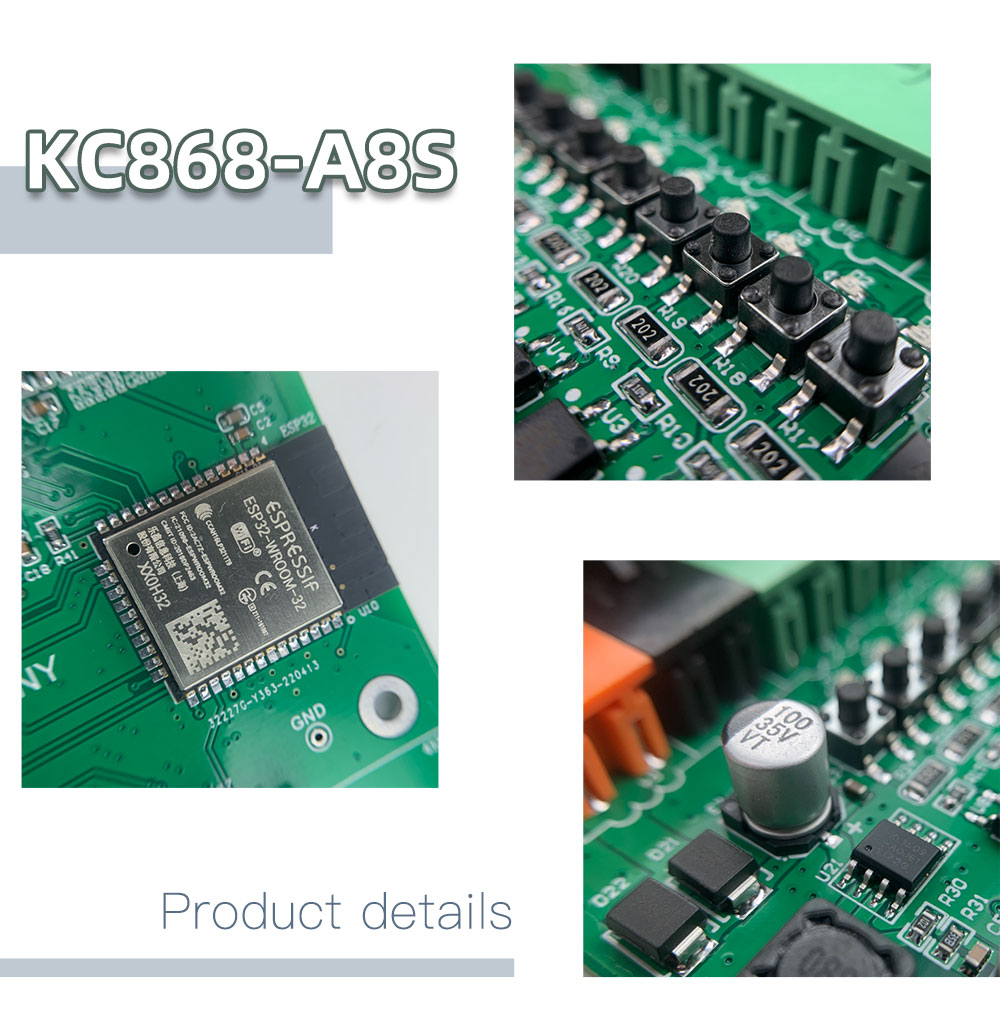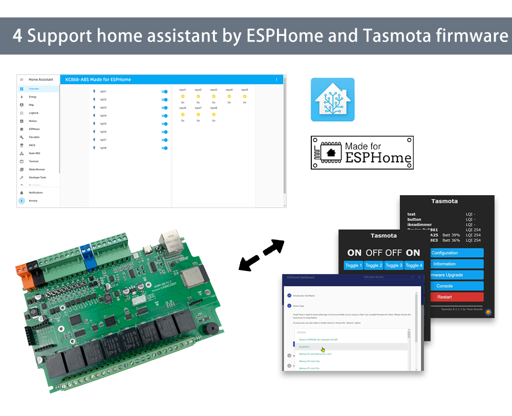 KC868-A8S esp32 board based on ESP32 wifi chip, many hardware resource for you to use. it support GSM module for SMS, voice call, GPRS communication. Use SMS or call to turn ON/OFF relay will be very easy for home automation DIY. You can write any code by Arduino IDE to ESP32 wifi/bluetooth/ethernet RS485 module. We will supply demo code for different samples. Everyone can modify and change the code for your own smart home automation system project. it support use by ESPHome for home assistant or tasmota firmware for smart home automation DIY.