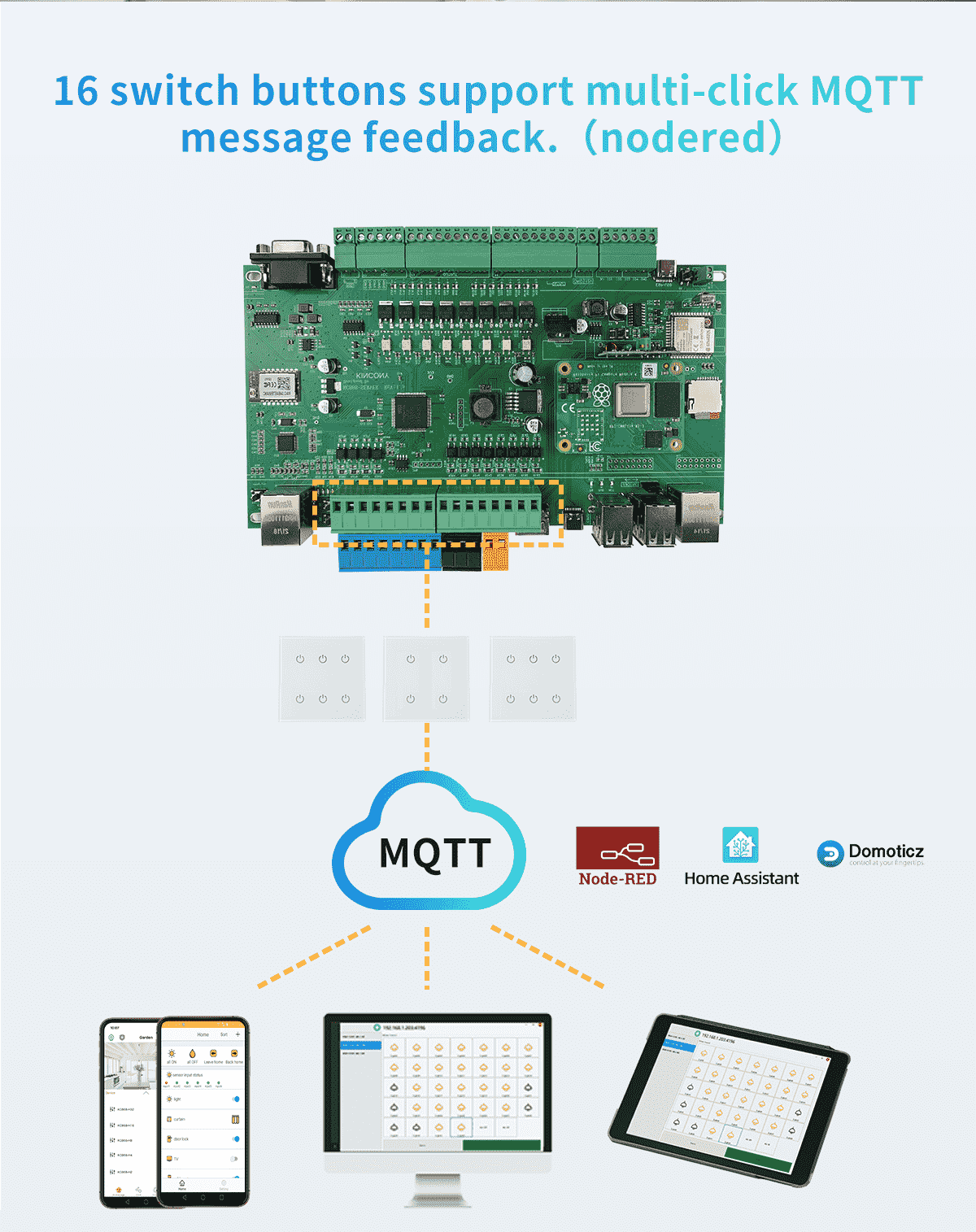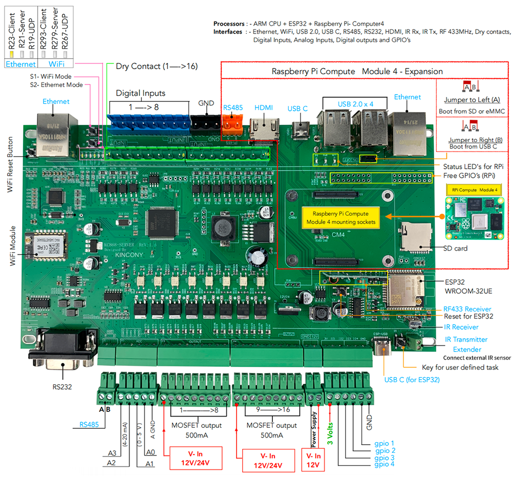 KC868-Server is a super smart controller for smart home automation and industrial automation control. KC868-Server smart controller support MOSFET output and wall switch connect to it directly. Also have analog input and digital input ports. The most important is integrated Raspberry pi CM4 module. Also integrated ESP32 module for you to write your own code. It’s very powerful and flexible.