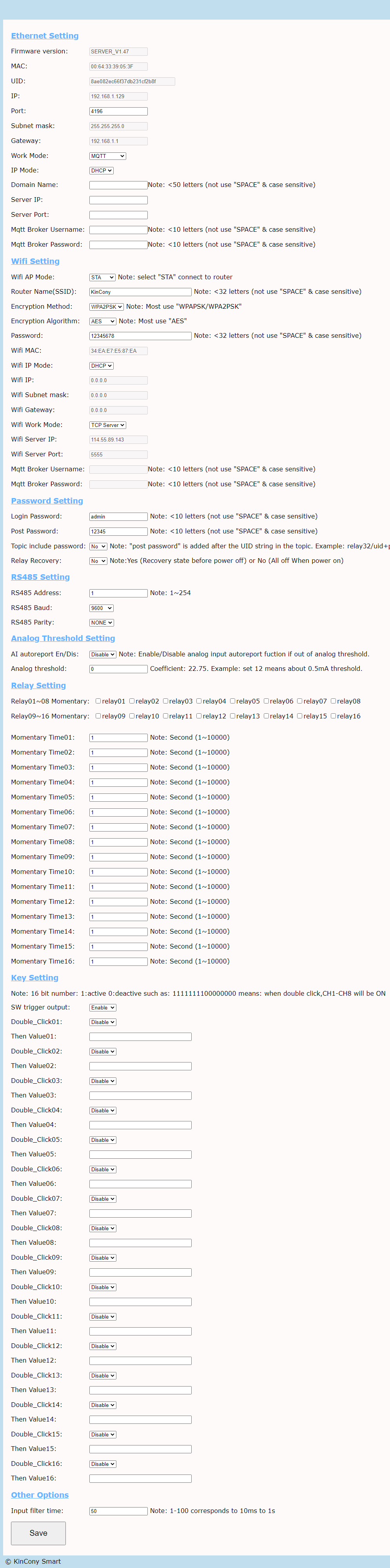 now you want to use “KinCony smart home ” phone app for remote control, so make sure your Protocol line is “UDP” and Server address is “114.55.89.143”,Port is “5555”. now all setting is finished, we press “Save”, then restart.