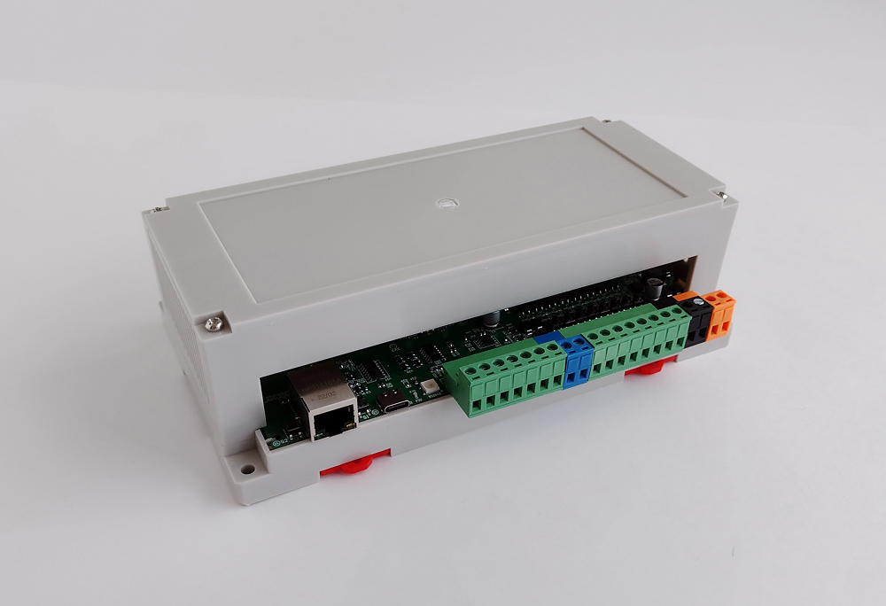 Kontroler je instaliran u proširenoj verziji kućišta na DIN šini. Općenito, nije loše, iako bi standardna (kratka) verzija kućišta više odgovarala – u gornjem poklopcu postoje rupe za ugradnju ekrana i za dodatne vanjske konektore, a kvaliteta plastike i njenog lijevanja kod ovog kontrolera je nešto bolja nego ranije. Ovdje je sve jednostavnije – ispred nas je skroman “radni konj” izrađen od sive plastike 4+ kvalitete (ali ne 5). Iako je funkcionalno kućište izrađeno savršeno – ima ispravnu geometriju, ojačane metalne rupe za vijke, sve se kombinira, rastavlja i sastavlja vrlo jednostavno i bez ikakvog napora. Pogled na kontroler s poleđine – možete vidjeti priključke digitalnih i analognih ulaza, konektor za spajanje vanjskog senzora, RS485 i Ethernet sučelja, kao i montažne ploče za pričvršćivanje kontrolera na DIN šinu (crveno na dnu). KC868-A8S ploča je zasebna.