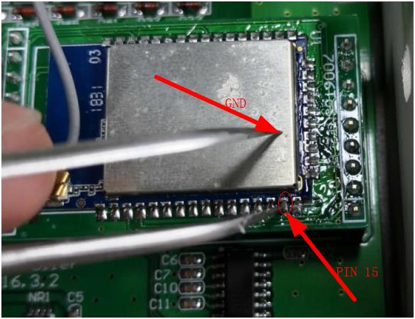 Open the cover of the device, and then get it power on, next, use the metal forceps or one electrical wire to connect the 15th pin of the wireless module (total 16 pins) and the ground for about 3 seconds, and then re-power on, see the below picture.