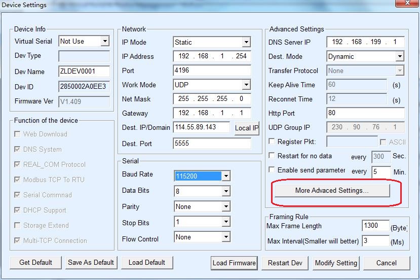 Then open the “Device Settings” window as below, click the “More Advanced Settings” button
