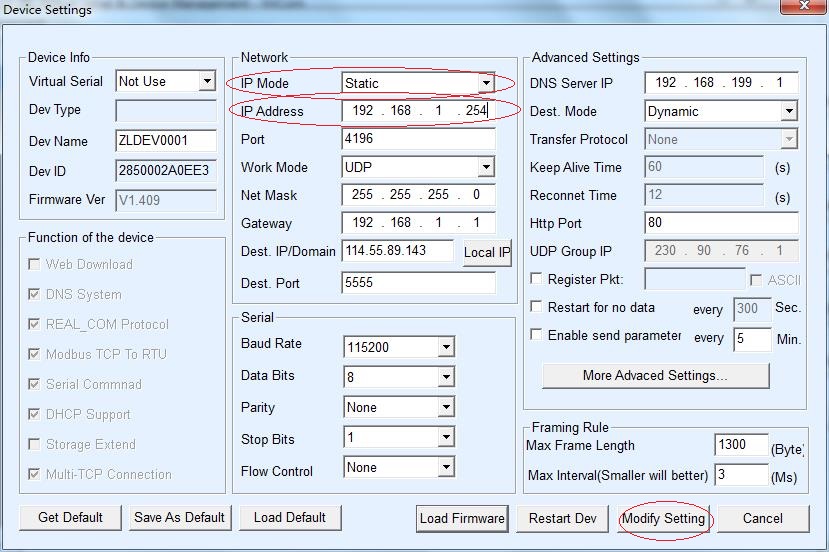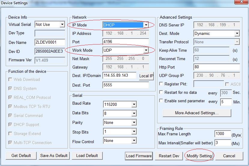 After returning the “Device Settings” window, please check IP Mode and Work Mode, make sure IP Mode is DHCP, and the Work Mode is UDP. See below picture. Then click the Modify Setting button to save it.