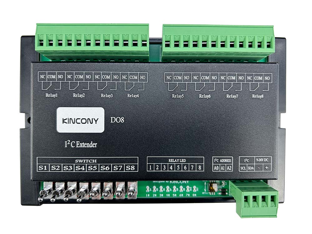 KinCony DO8 is PCF8574 IO Expansion i2c relay board. extend 8 channel 10A relay. manual control buttons on board can control relay ON/OFF directly without any software. manual control buttons control relay’s coin physically. A0,A1,A2 PCF8574 i2c address can set by DIP switch. DO8 support install on DIN RAIL.