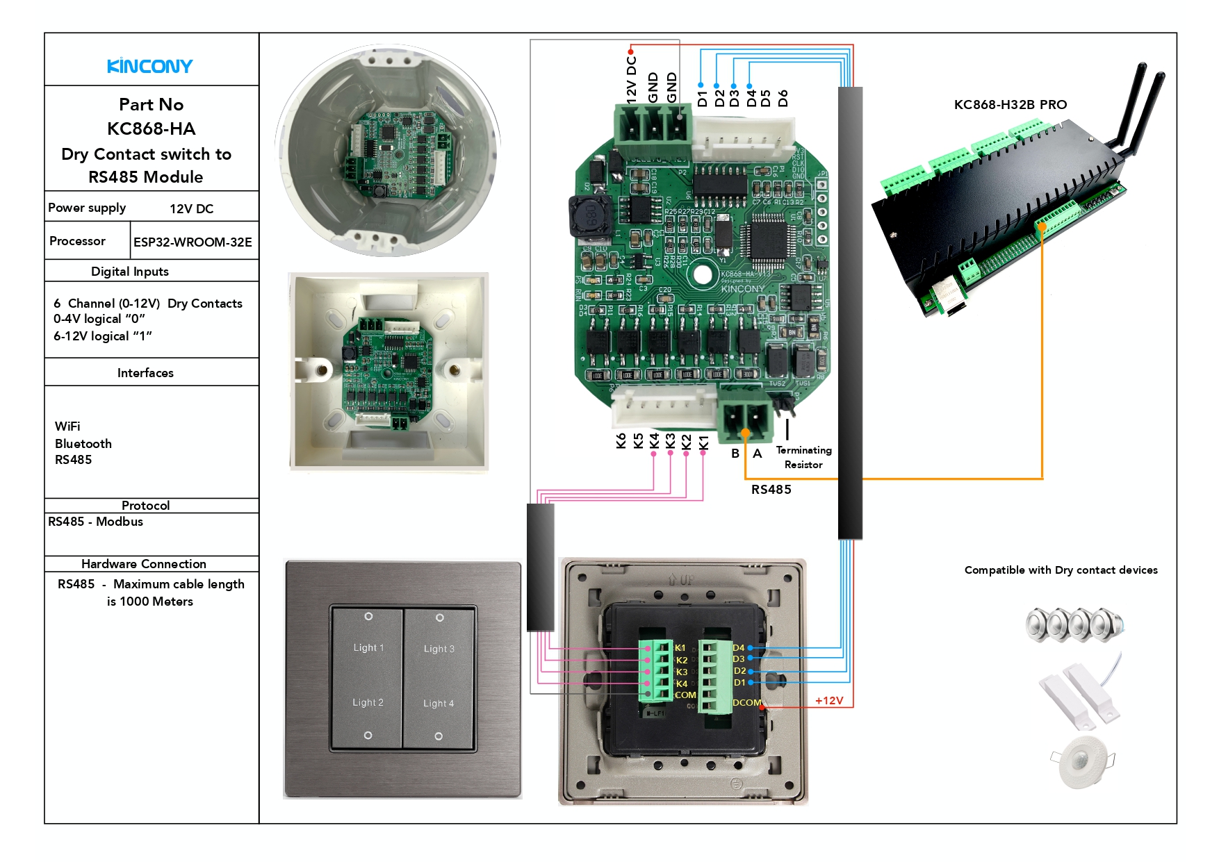 KC868-HA let your old switch or traditional switch become support RS485 modbus protocol for KinCony’s relay controller, work with KC868-H32B Pro smart relay controller, use any “Latch” or “Momentary” switch panel work with your smart home automation.